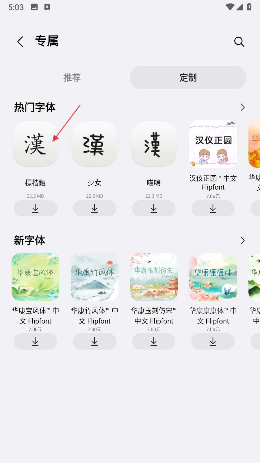 3、在定制界面里,找到熱門字體區(qū)域,選擇想要下載的字體,點(diǎn)擊進(jìn)入該字體的詳情頁(yè)面。