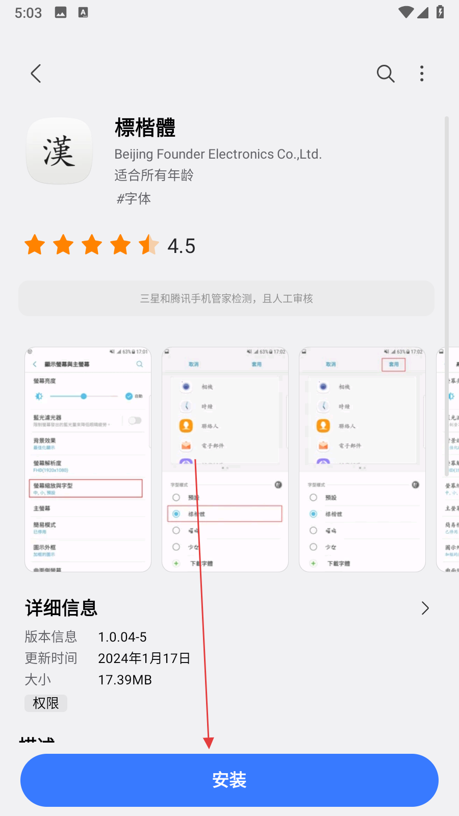 4、在字體詳情頁(yè)面,點(diǎn)擊底部的安裝按鈕,等待下載安裝完成即可。