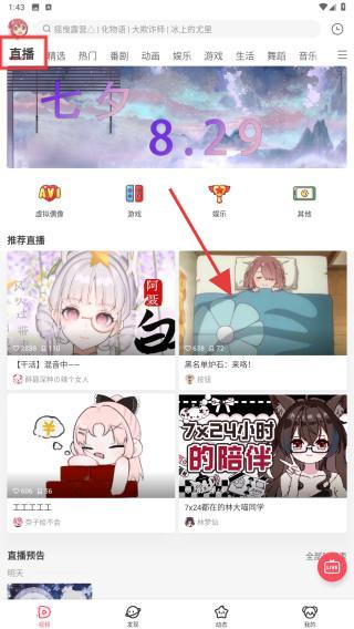 2、直播專區(qū)會(huì)呈現(xiàn)兩類內(nèi)容:推薦直播、分類入口,用戶可任需點(diǎn)擊直播封面。