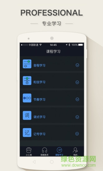 多效合一的APP : 音程, 和弦, 和弦轉(zhuǎn)位, 音階, 和弦進(jìn)行, 旋律, 節(jié)奏等等。課程循序漸進(jìn),從入門到高級(jí)水平, 一步步修煉你的整體練耳能力, 是完整全面的學(xué)習(xí)工具。