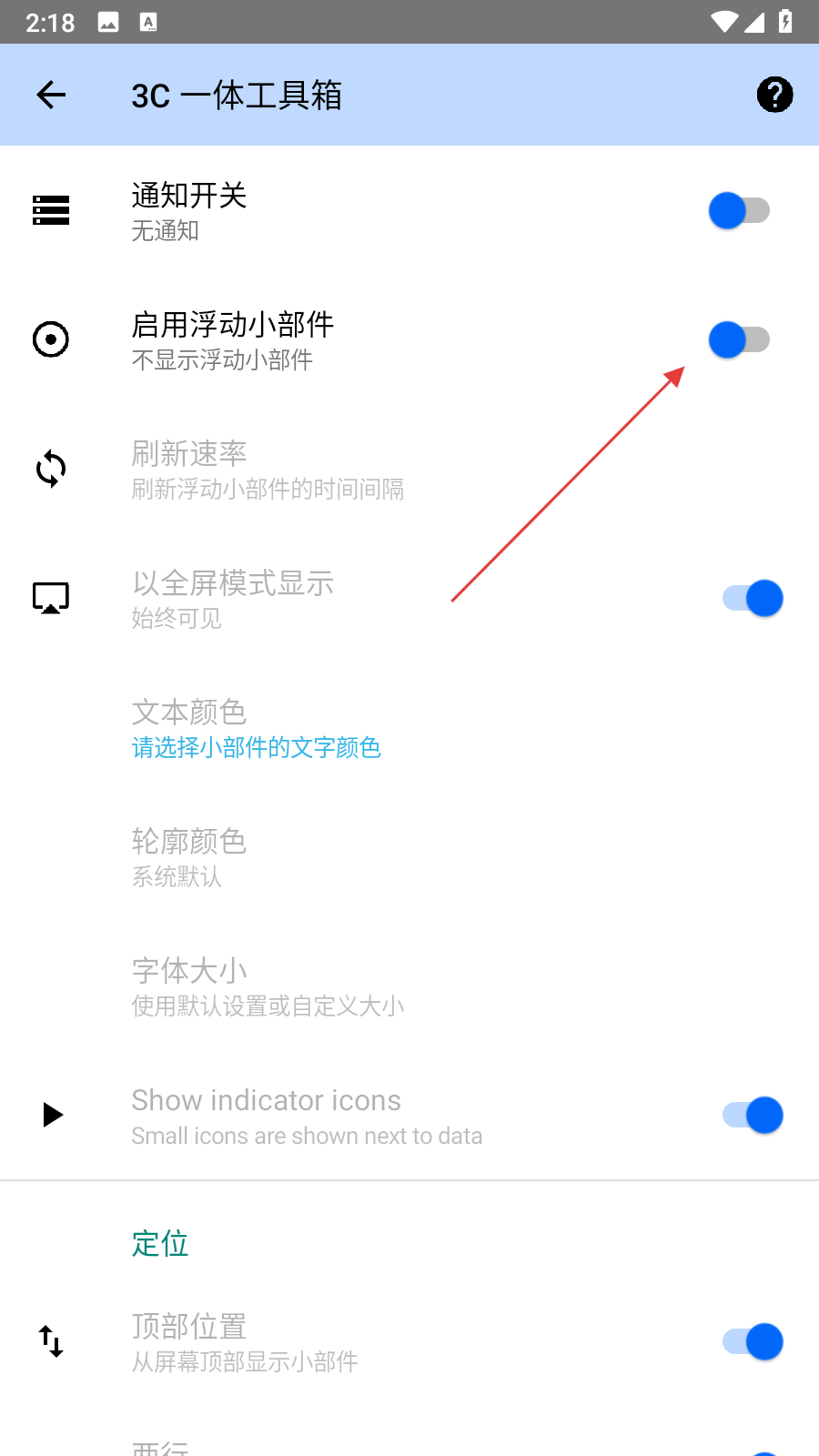 3、在浮動小部件設(shè)置頁面,找到啟用浮動小部件開關(guān)并將其開啟。