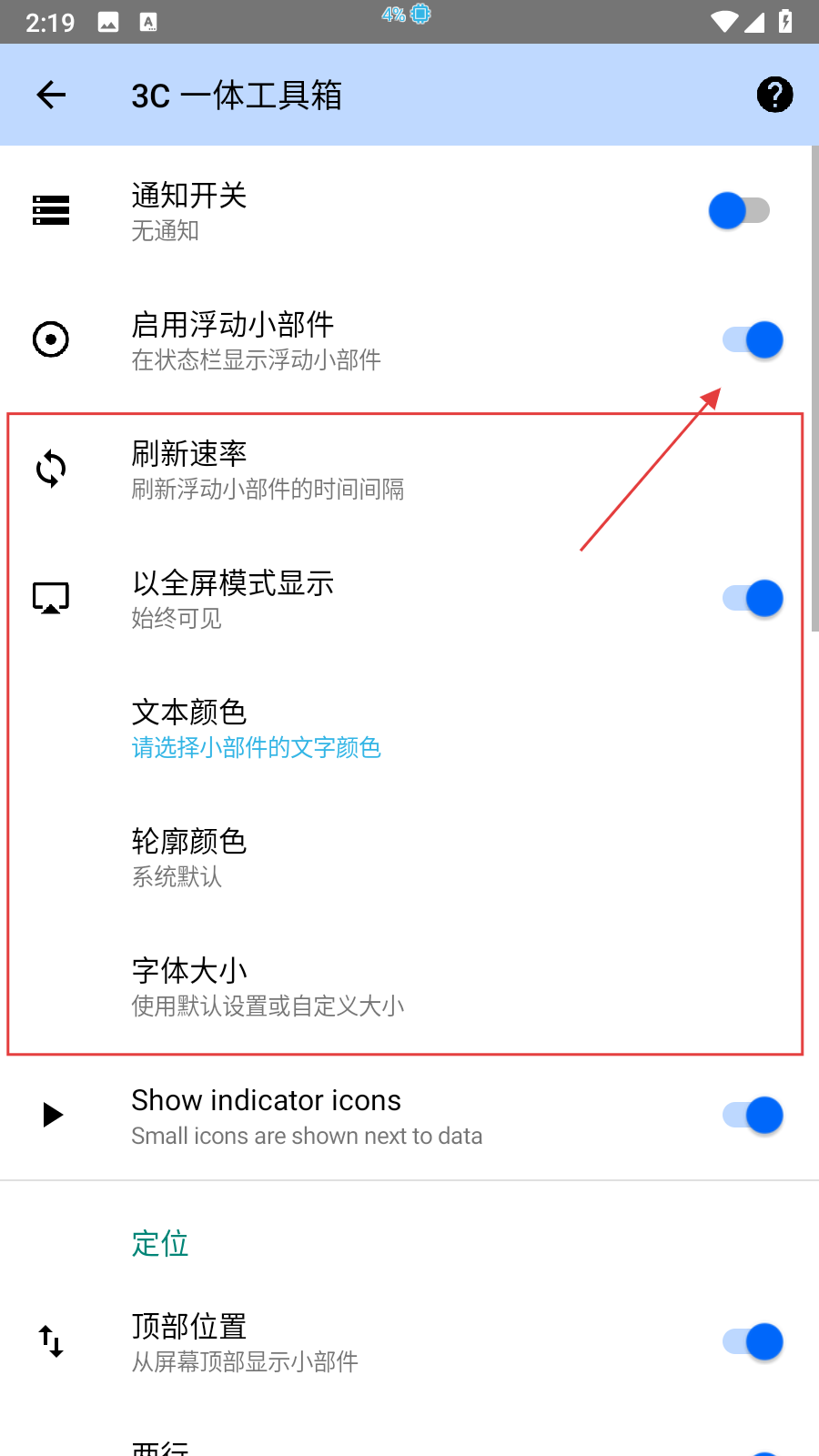 4、開啟后,可根據(jù)需求進一步設(shè)置刷新速率、顯示模式、文本顏色、字體大小等參數(shù),完成浮動小部件的個性化配置。