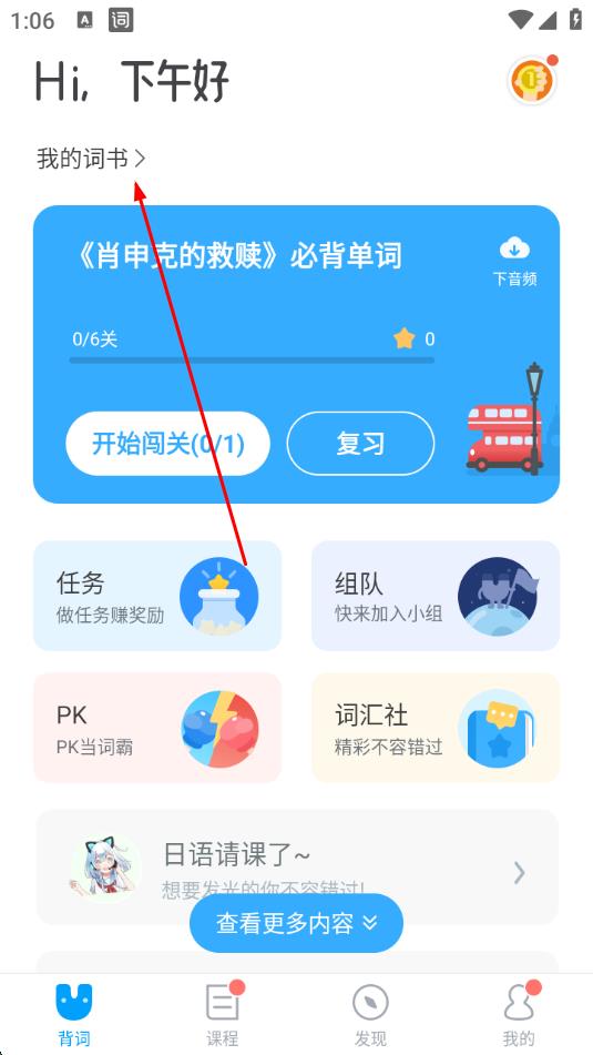 1、打開(kāi)滬江開(kāi)心詞場(chǎng)應(yīng)用,在首頁(yè)點(diǎn)擊我的詞書(shū)。