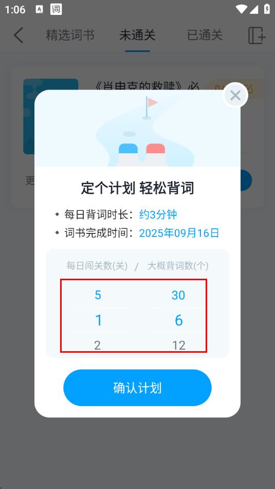 3、在每日闖關(guān)數(shù)(關(guān))/大概背詞數(shù)(個(gè))選項(xiàng)中,選擇每日闖關(guān)數(shù)及對(duì)應(yīng)的大概背詞數(shù)。
