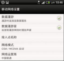 3.設(shè)置“移動網(wǎng)絡(luò)”,如右圖將“數(shù)據(jù)漫游”選中;如使用連接到漫游網(wǎng)絡(luò)時(shí)播放聲音,將“數(shù)據(jù)漫游音”選中。