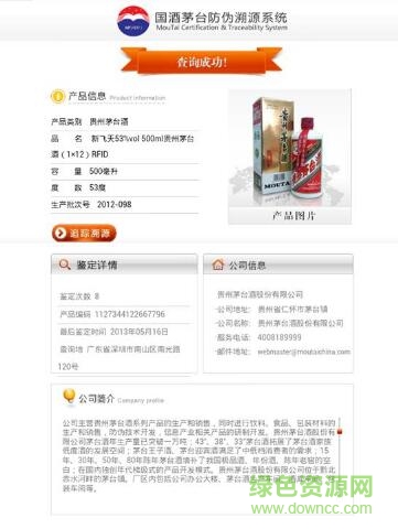 2.將手機(jī)正背后的NFC感應(yīng)區(qū)對準(zhǔn)茅臺的RFID瓶標(biāo)位置,“嘀”的一聲后,停留片刻,如果查詢成功則顯示如下圖類似頁面: