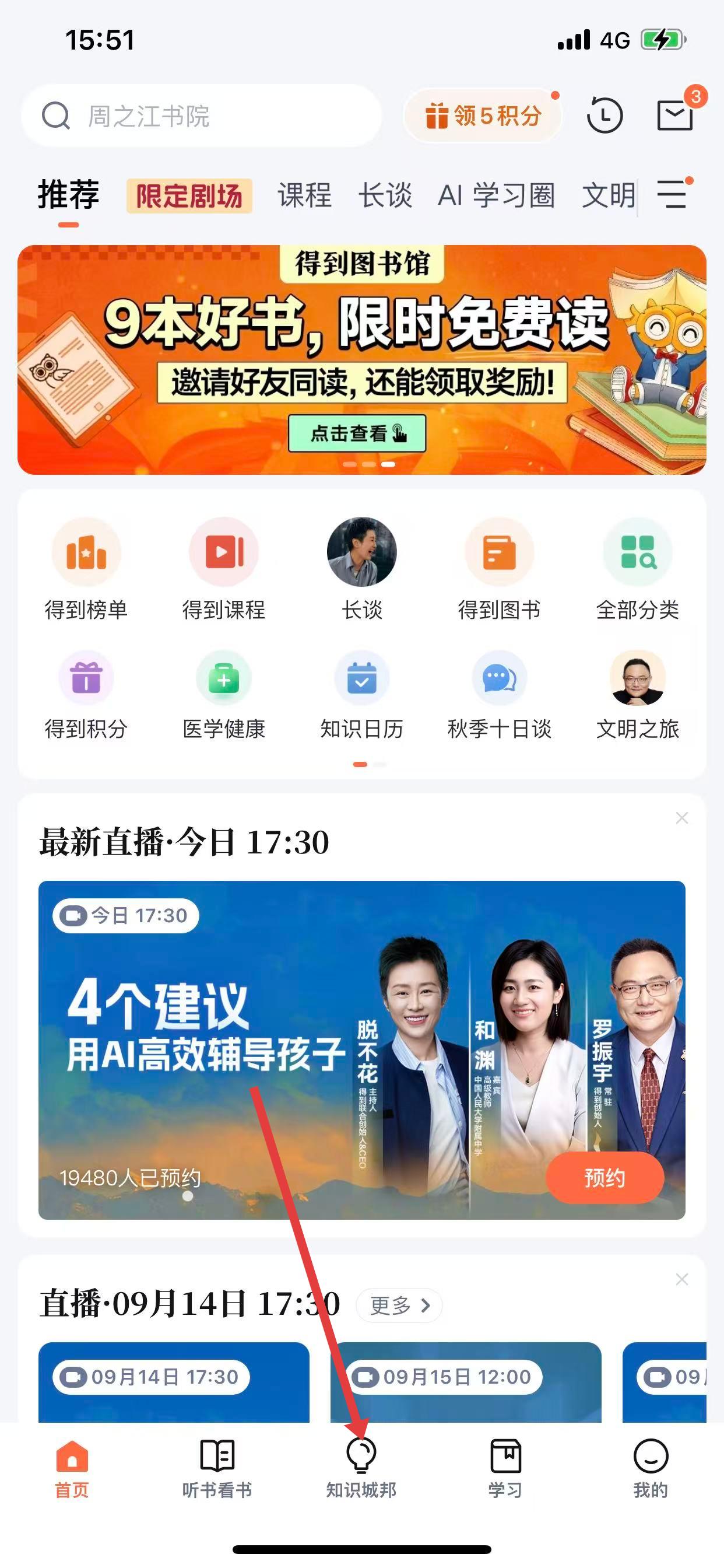1、打開得到App,點(diǎn)擊底部導(dǎo)航欄中的知識城邦圖標(biāo)。