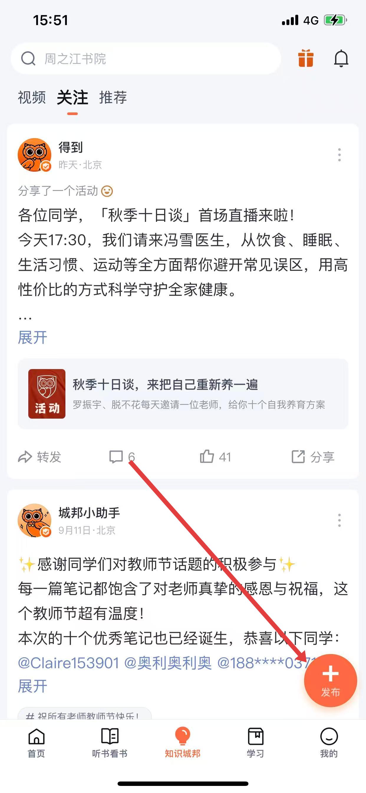 2、進(jìn)入“知識城邦”頁面后,點(diǎn)擊右下角的+發(fā)布按鈕。