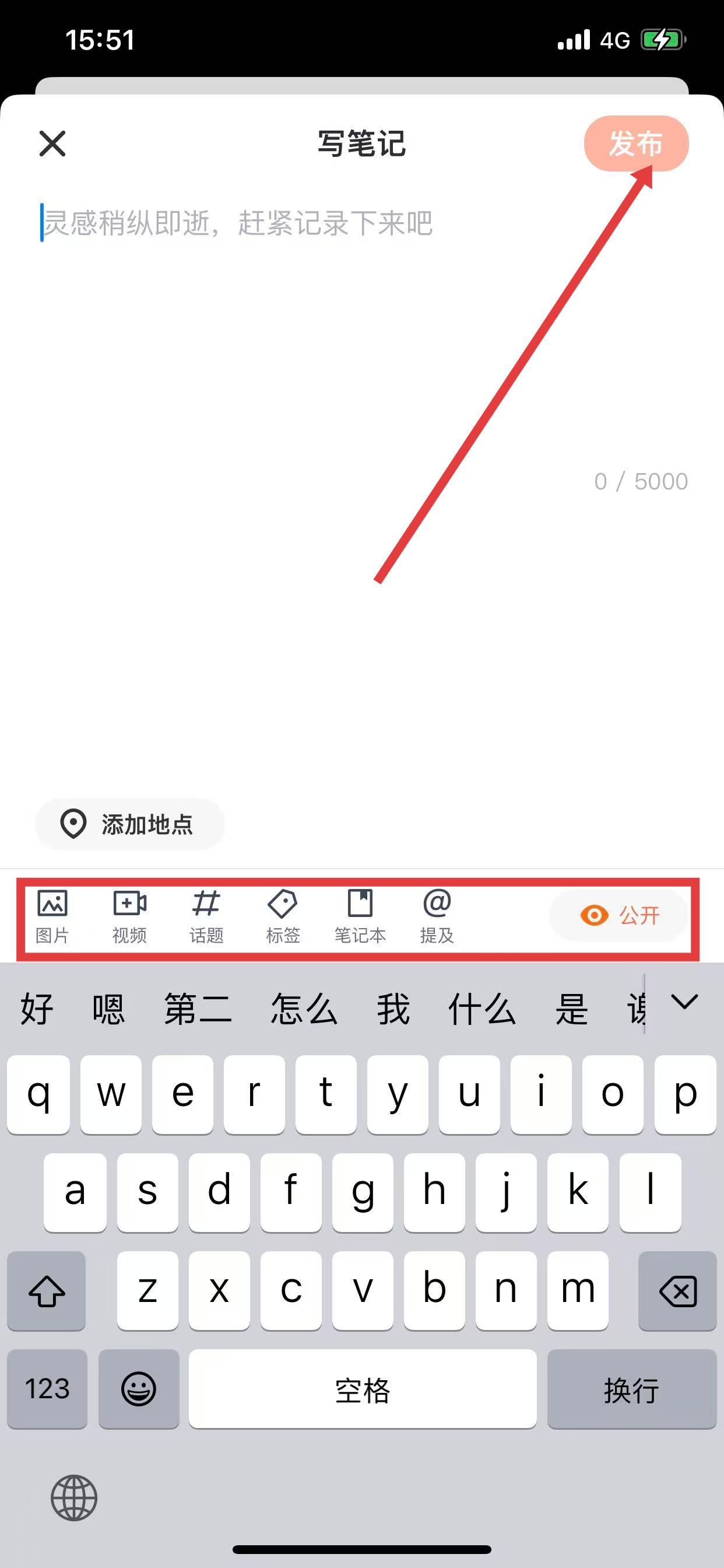 3、輸入想要發(fā)布的動態(tài)內(nèi)容 ,添加圖片、視頻,帶上話題、標(biāo)簽,選擇筆記本分類、設(shè)置公開或私密狀態(tài)等,點(diǎn)擊發(fā)布按鈕。