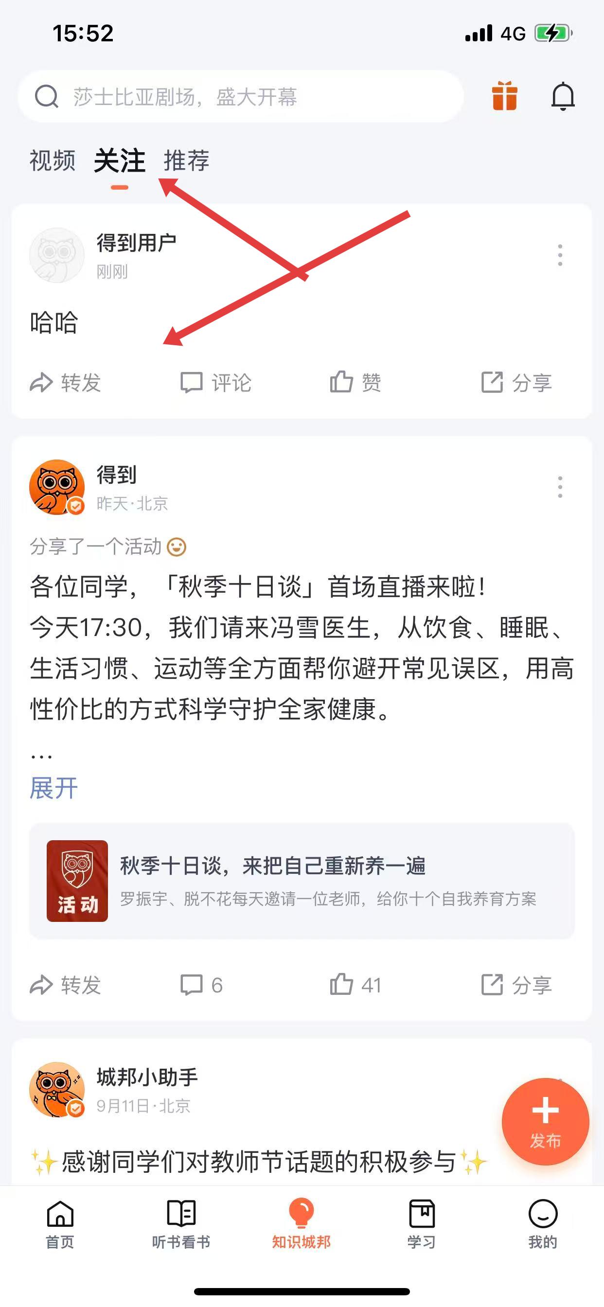 4、成功發(fā)布后,就能夠在關(guān)注列表中看到剛剛發(fā)布的動態(tài)內(nèi)容。