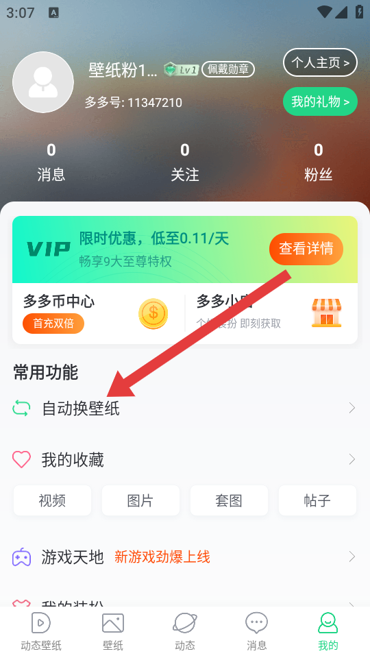 2、在我的頁(yè)面中,找到自動(dòng)換壁紙的選項(xiàng)并點(diǎn)擊,進(jìn)入自動(dòng)換壁紙?jiān)O(shè)置的頁(yè)面。