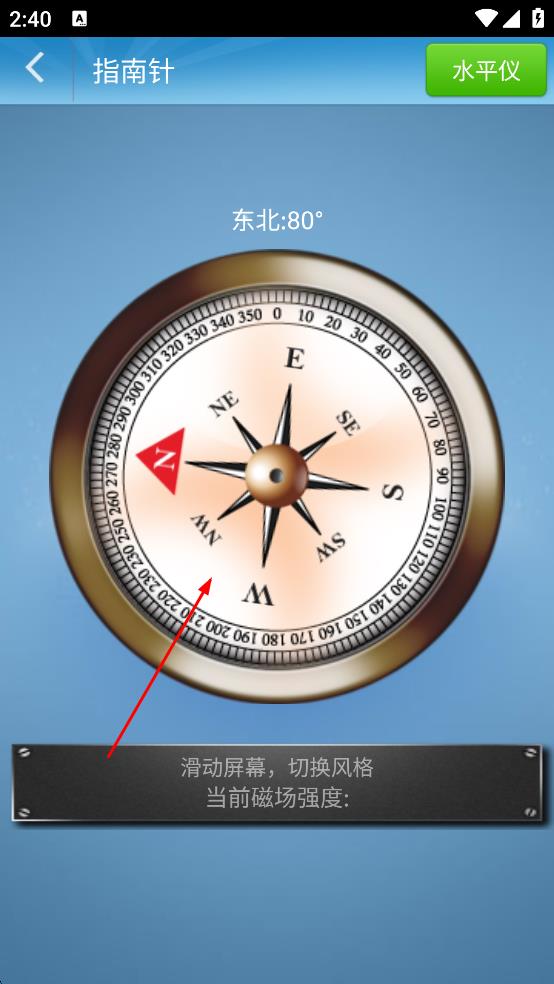 3、進(jìn)入指南針頁面,查看羅盤指示方向,可滑動(dòng)屏幕切換風(fēng)格,同時(shí)查看當(dāng)前磁場強(qiáng)度等信息 。