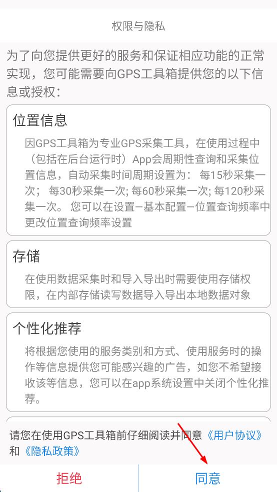 1、打開GPS工具箱,彈出權(quán)限與隱私說明頁,閱讀位置信息、存儲(chǔ)、個(gè)性化推薦等權(quán)限內(nèi)容后,點(diǎn)擊“同意”,進(jìn)入應(yīng)用首頁 。