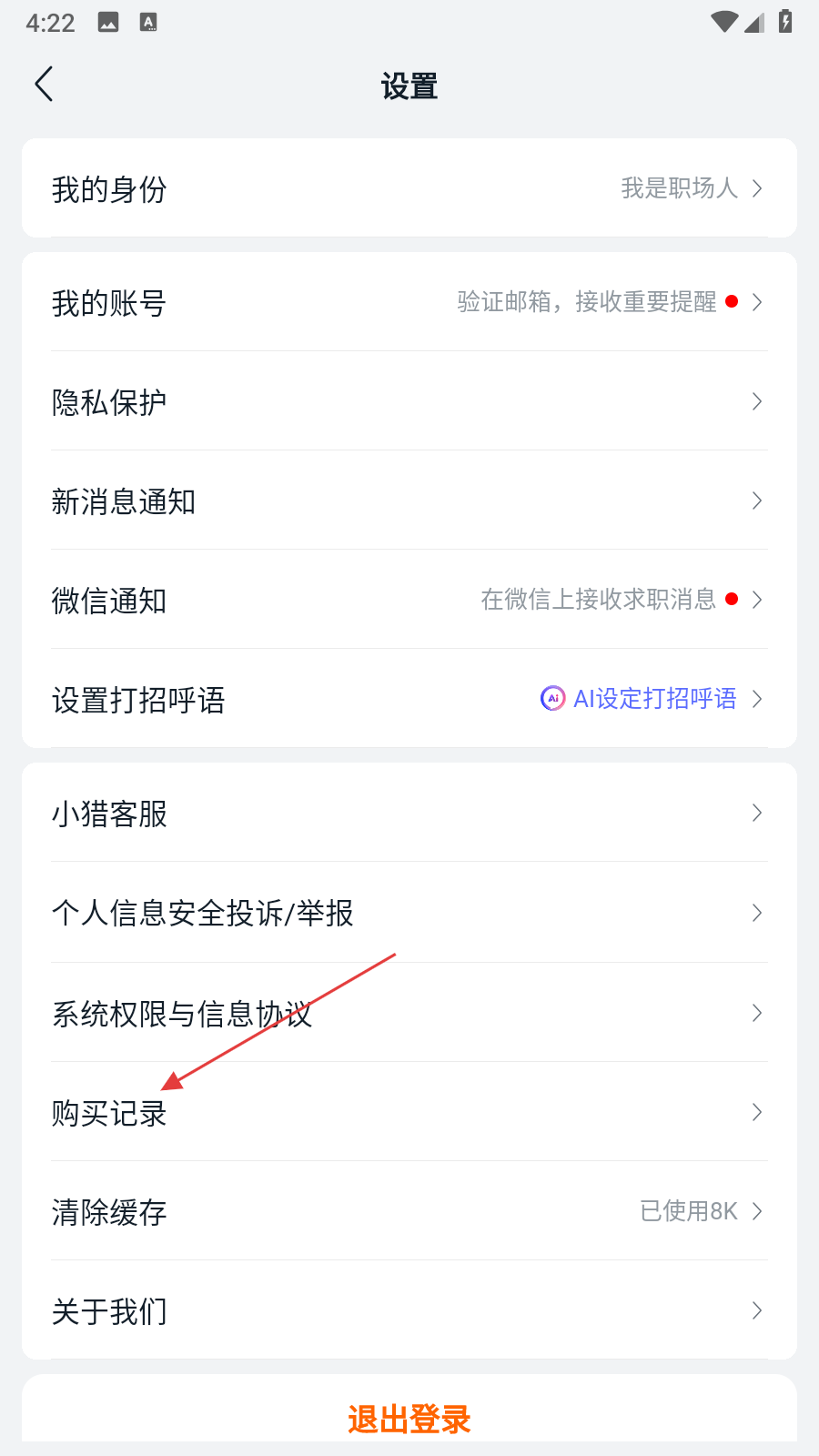 3、在設(shè)置界面中,點(diǎn)擊購(gòu)買記錄選項(xiàng),進(jìn)入購(gòu)買記錄頁面。