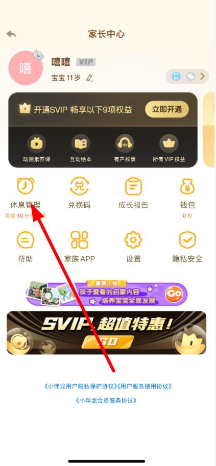 2、在家長(zhǎng)中心界面中,點(diǎn)擊休息管理選項(xiàng)。
