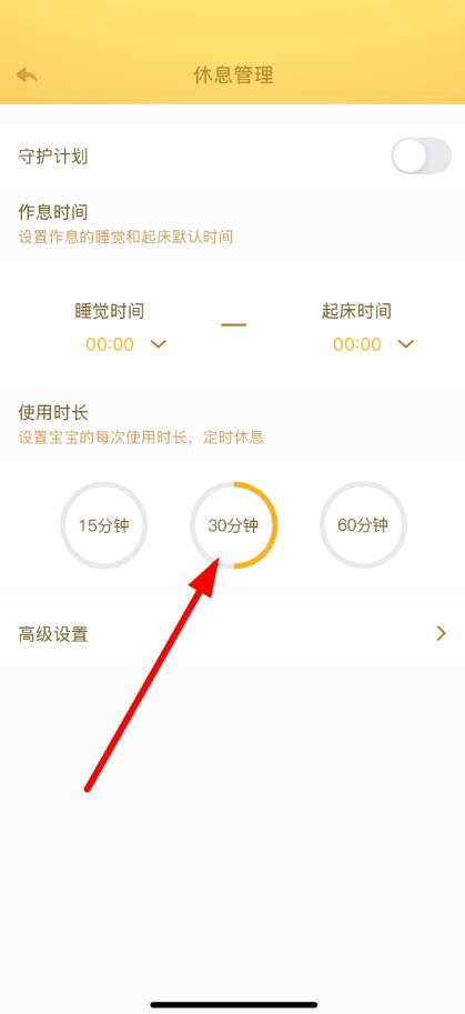 3、在休息管理頁(yè)面,找到使用時(shí)長(zhǎng)區(qū)域,選擇15分鐘、30分鐘或60分鐘,即可完成游戲時(shí)間設(shè)置。
