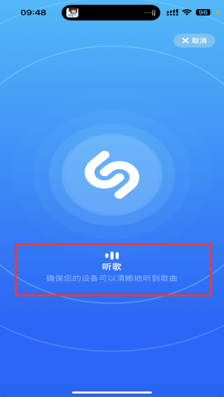 2、點(diǎn)擊后彈出識(shí)別的頁(yè)面,識(shí)別前手機(jī)需要額外播放歌曲,再輕點(diǎn)開始Shazam識(shí)別的按鈕。