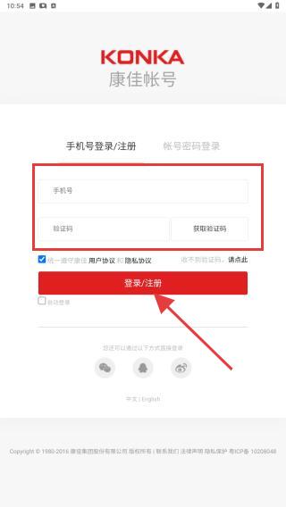 2、點(diǎn)擊我的頁面頂部的登錄/注冊(cè)按鈕,跳轉(zhuǎn)至康佳賬號(hào)登錄界面。