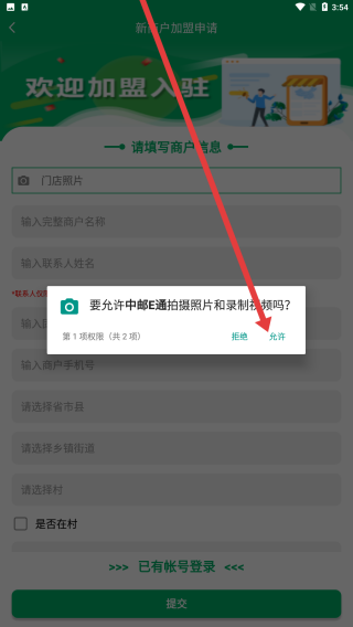 2、彈出權(quán)限申請(qǐng)彈窗時(shí),點(diǎn)擊允許,授予中歐E通拍攝照片和錄制視頻的權(quán)限,為上傳門(mén)店照片做準(zhǔn)備。