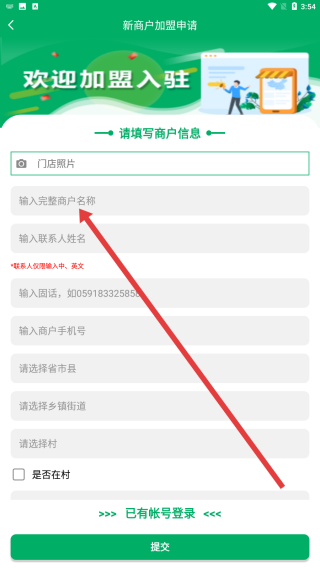 1、在登錄界面點(diǎn)擊我要加盟按鈕,進(jìn)入新商戶加盟申請(qǐng)流程,開(kāi)啟加盟入駐的第一步操作。