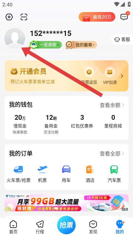 1、打開高鐵管家APP,進入我的頁面后,點擊左上角的頭像圖標(biāo),進入個人中心界面,這是賬號注銷流程的前置操作。