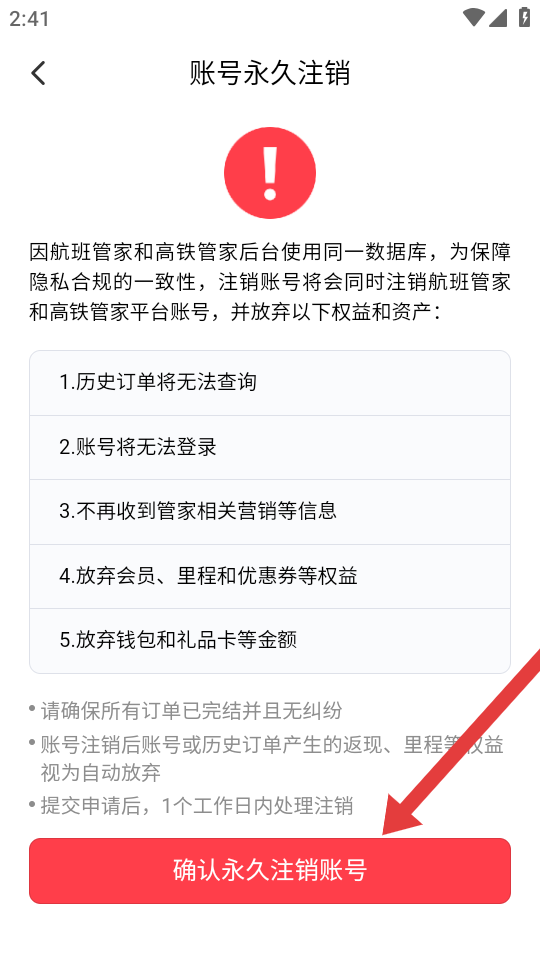 3、進入賬號永久注銷頁面后,仔細閱讀注銷提示,確認(rèn)無誤后點擊紅色確認(rèn)永久注銷賬號按鈕,完成賬號注銷申請。