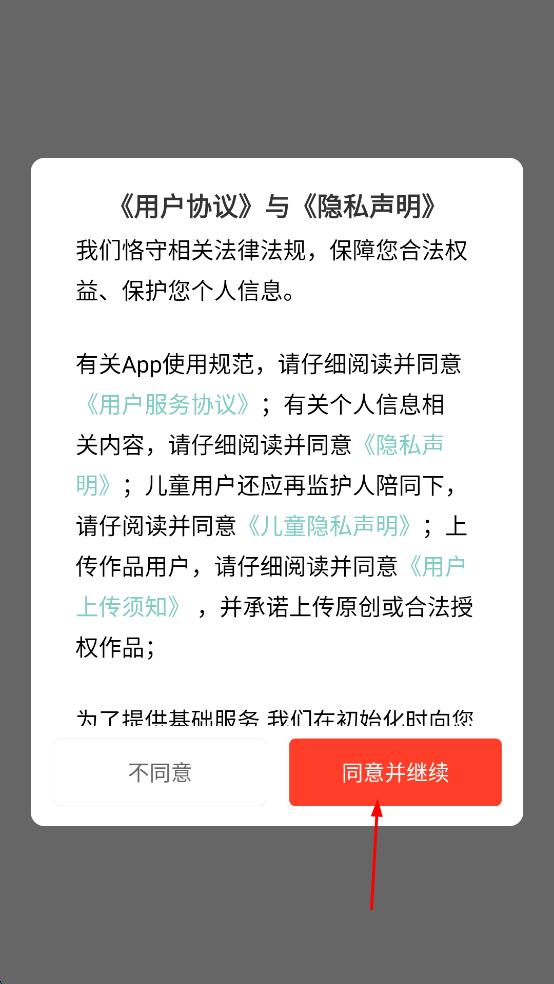 1、打開火螢App,彈出《用戶協(xié)議》與《隱私聲明》窗口,仔細(xì)閱讀內(nèi)容后,點(diǎn)擊“同意并繼續(xù)”,完成協(xié)議確認(rèn) 。