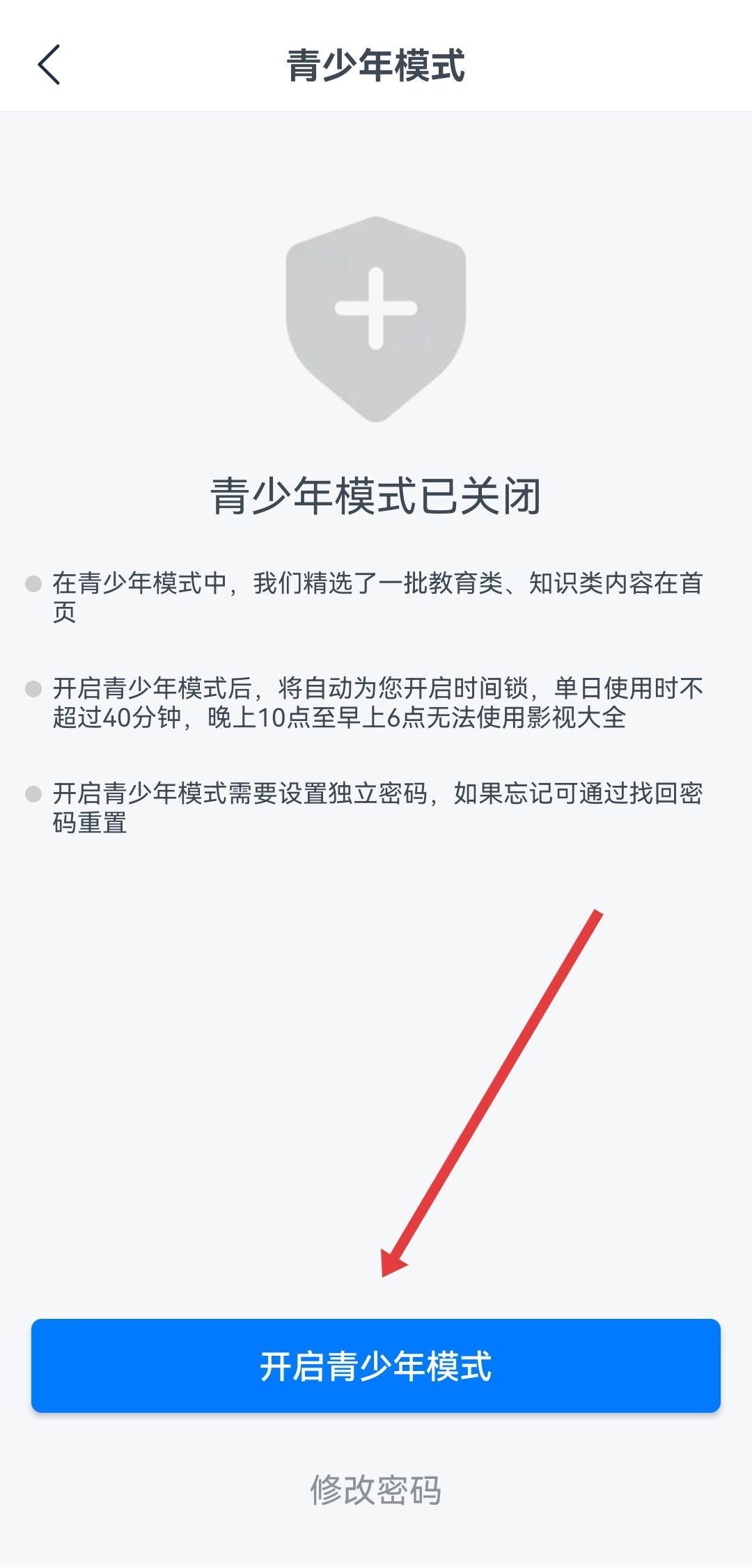 3、在青少年模式頁面,點擊開啟青少年模式按鈕,按照提示設(shè)置密碼,即可成功開啟青少年模式。