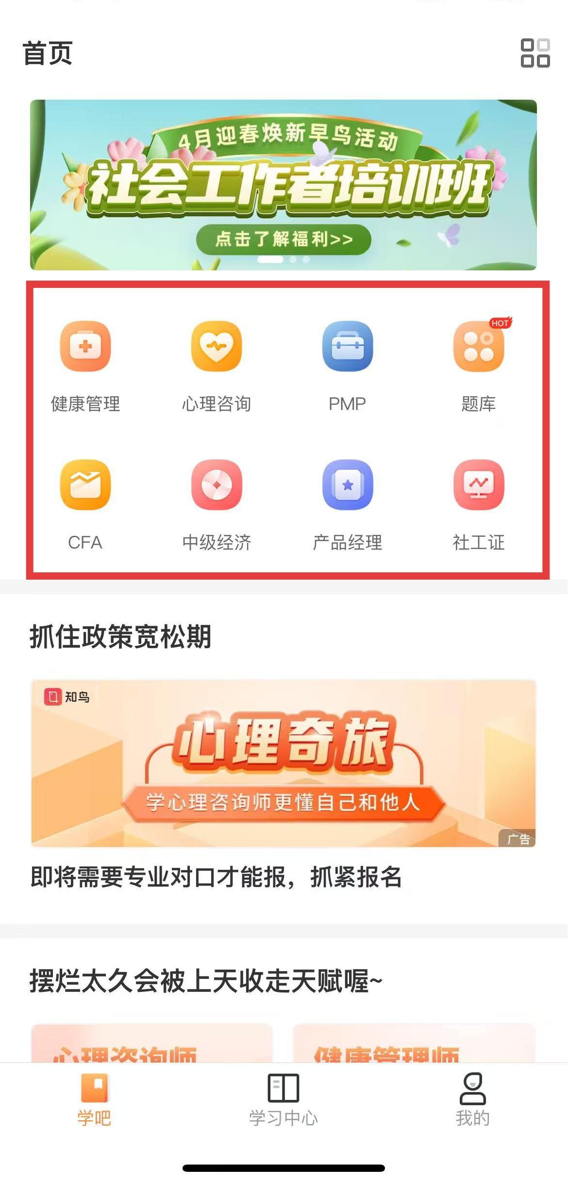 1、點擊底部導(dǎo)航欄中的學(xué)吧,進入學(xué)吧頁面,在這里能查看各種各樣學(xué)習(xí)相關(guān)的分類。