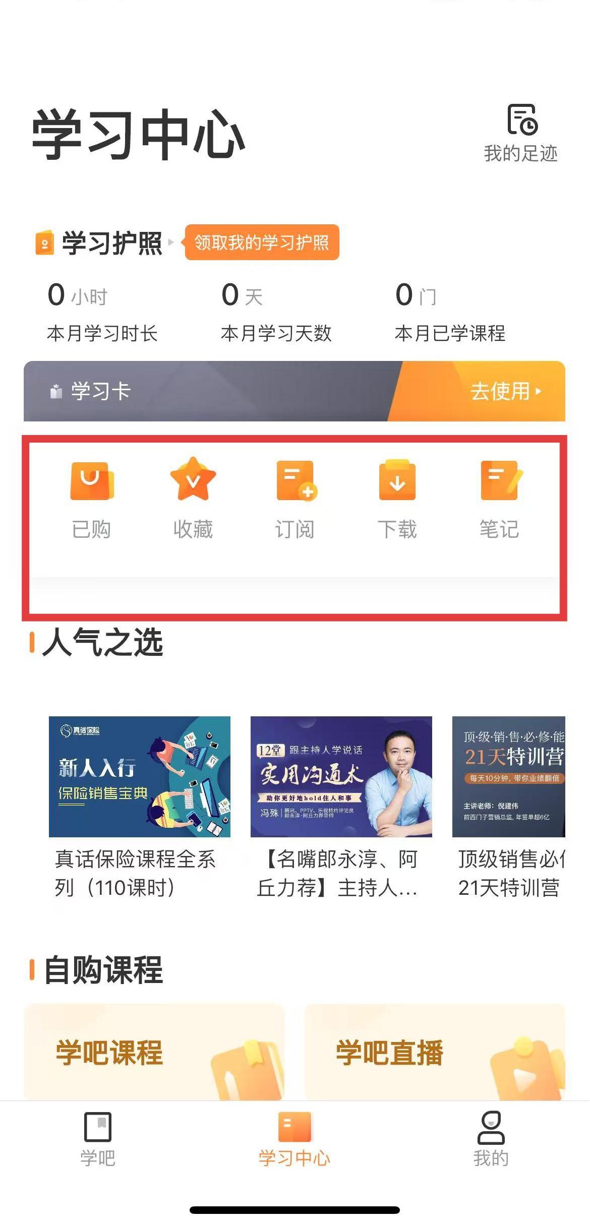 2、在學(xué)習(xí)中心頁面,有已購、收藏、訂閱、下載、筆記等功能按鈕,功能分明,便于用戶使用app功能。