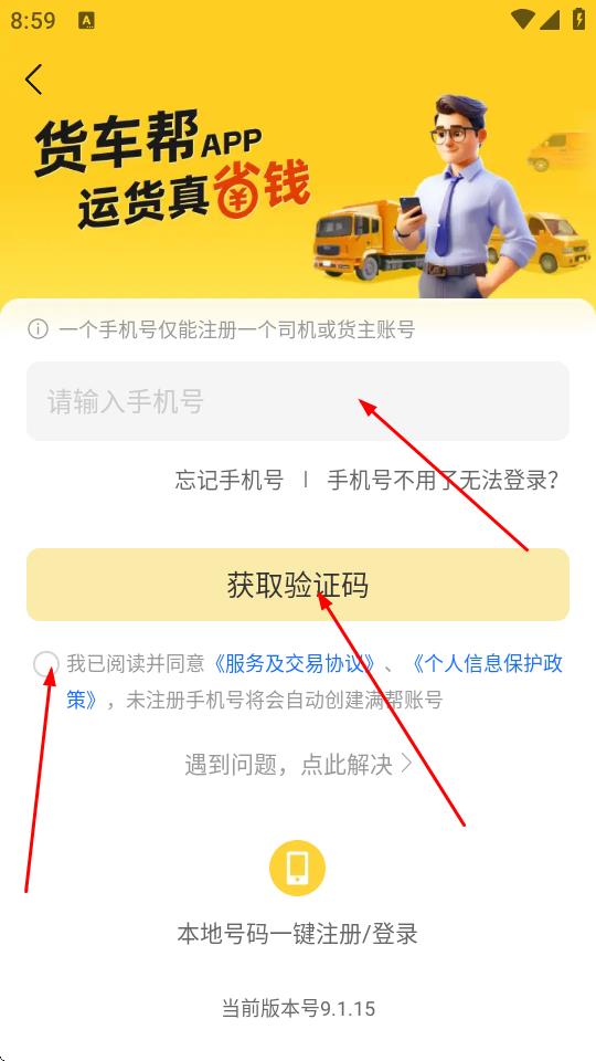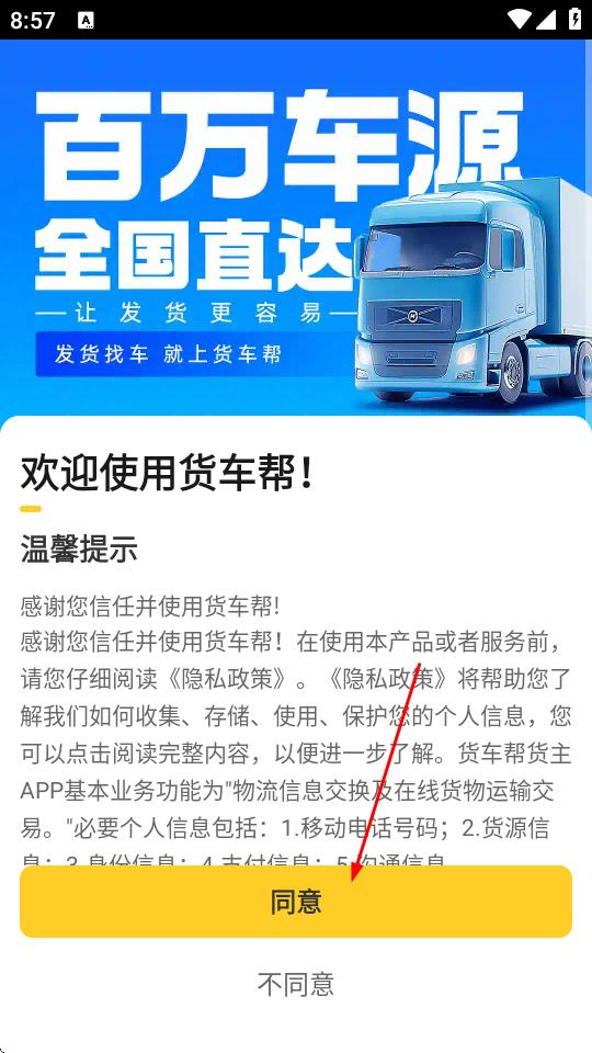 1、打開貨車幫貨主APP,在彈出的溫馨提示頁面,點擊同意隱私政策。