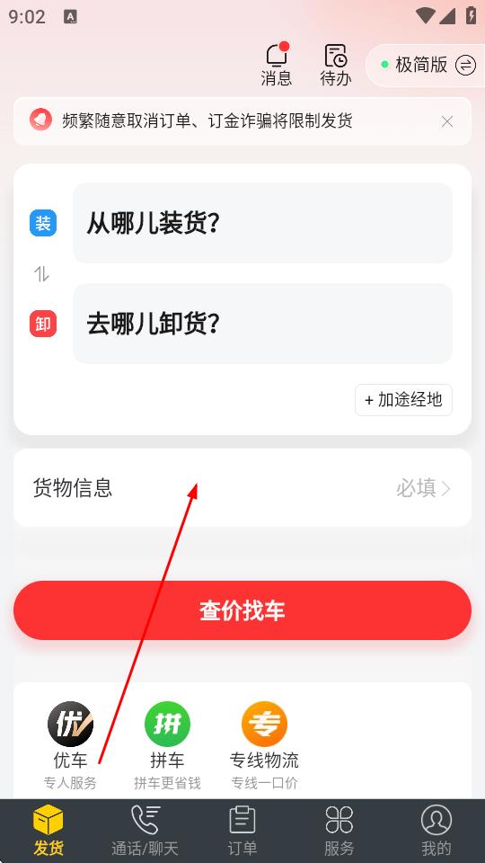 4、完成驗證后,進(jìn)入APP主界面,根據(jù)提示完善裝貨地、卸貨地、貨物信息等資料,即可完成注冊并開始使用。