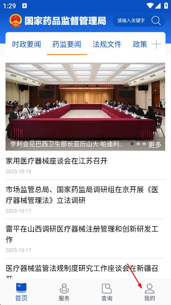 1、打開(kāi)國(guó)家藥品監(jiān)督管理局軟件,點(diǎn)擊頁(yè)面右下角“我的”按鈕,進(jìn)入個(gè)人相關(guān)頁(yè)面。