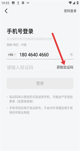 4、手機號登錄界面輸入手機號,點擊“獲取驗證碼”,輸入收到的驗證碼后完成賬號登錄操作。