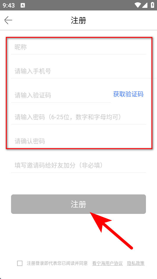 4、在賬號注冊填寫頁面,依次填寫昵稱等信息后,點擊注冊完成操作。