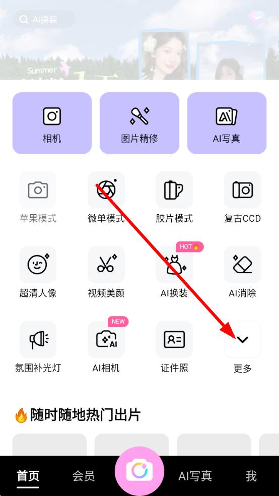 1、打開美顏相機APP,點擊首頁中的更多向下箭頭圖標,展開隱藏的功能選項。