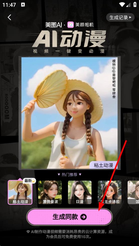 3、在AI動漫制作界面中,選擇合適的模板,點擊生成同款,根據(jù)提示操作,即可生成類似素描風格的動漫效果圖片。