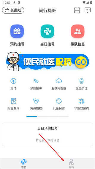 1、打開閔行捷醫(yī)app,點(diǎn)擊首頁右下角我的選項(xiàng)。