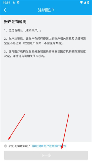 5、在注銷賬戶頁面,勾選用戶注銷賬戶協(xié)議,點(diǎn)擊下一步。