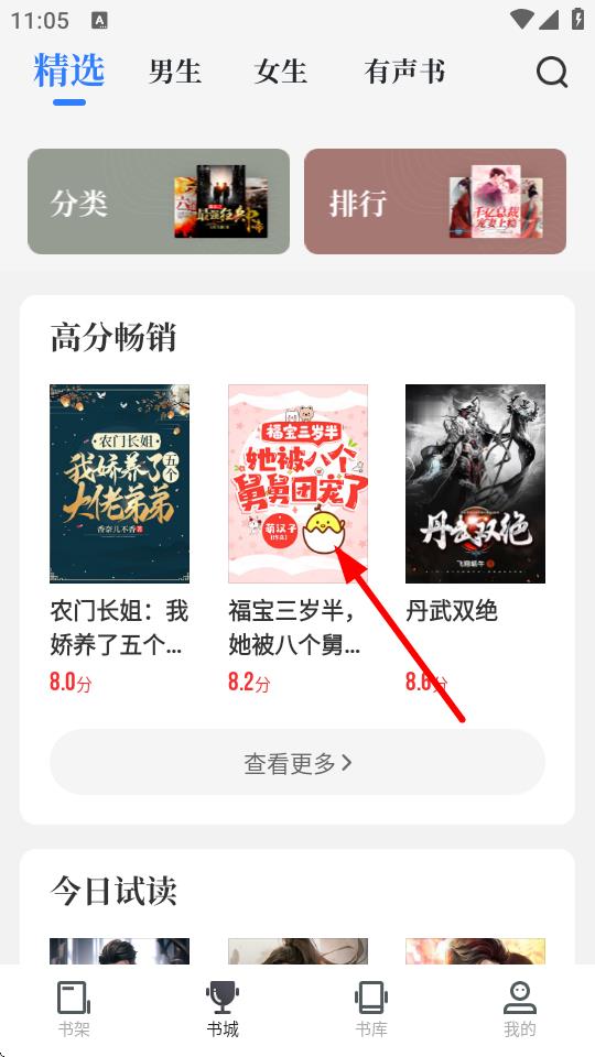 1、打開中文書城APP,在精選頁面找到并點擊小說福寶三歲半,她被八個舅舅團寵了。
