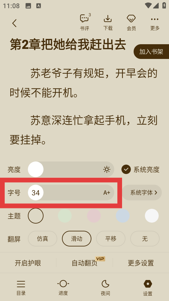 4、在彈出的設置窗口里,找到字號一欄,通過滑動滑塊或點擊A+來增大字體大小,以調(diào)整到合適的閱讀字號。