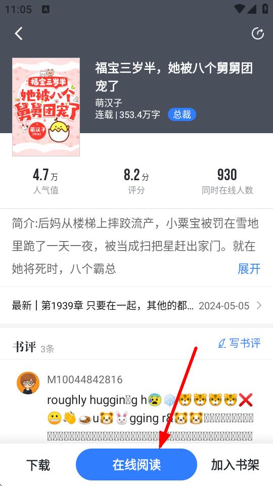 2、進入小說詳情頁后,點擊下方藍色的在線閱讀按鈕,進入閱讀界面。