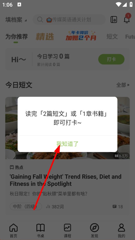 2、彈出讀完「2篇短文」或「1章書籍」即可打卡提示,點擊我知道了關閉彈窗。