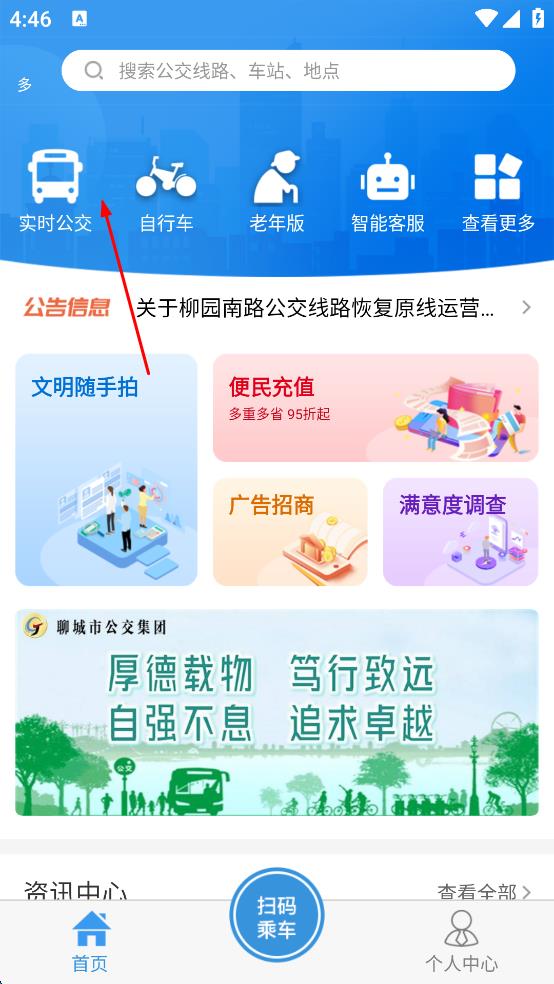 1、打開軟件進(jìn)入首頁,找到并點擊“實時公交”選項,進(jìn)入實時公交查詢界面 。