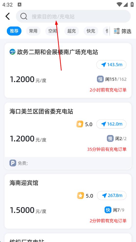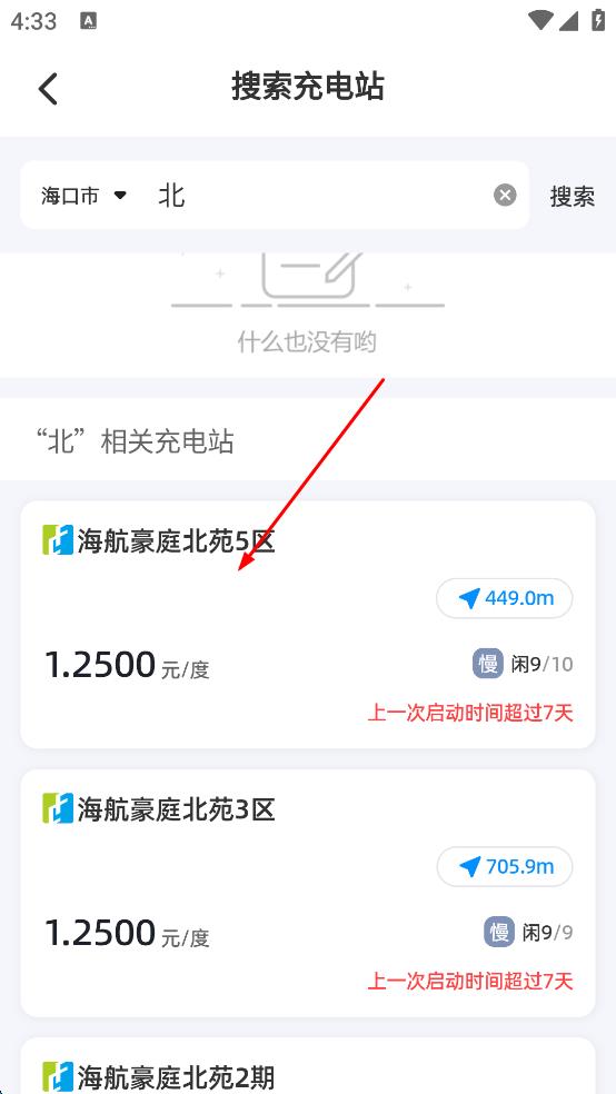 3、在搜索結(jié)果中,選擇心儀充電站(如海航豪庭北苑5區(qū) ),查看其距離、電價(jià)、空閑樁等信息,準(zhǔn)備前往充電。