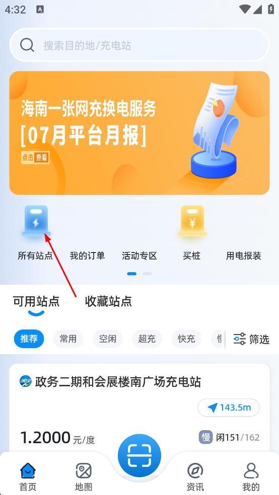 1、打開(kāi)充電服務(wù)軟件,點(diǎn)擊首頁(yè)“所有站點(diǎn)”圖標(biāo),進(jìn)入站點(diǎn)列表頁(yè)面,可查看推薦、常用等分類站點(diǎn)。
