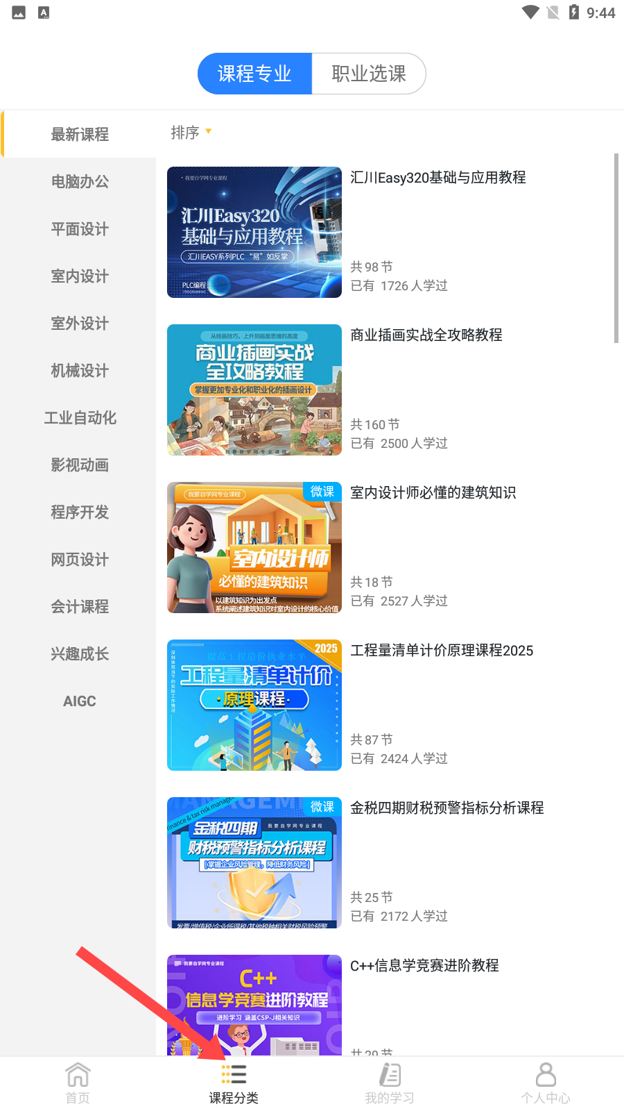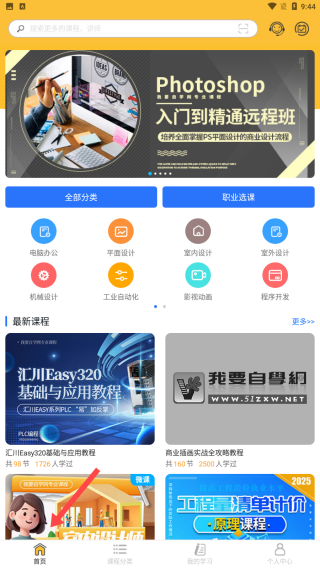 2、點(diǎn)擊課程分類(lèi),呈現(xiàn)豐富課程,覆蓋電腦辦公、平面設(shè)計(jì)等多領(lǐng)域,如匯川Easy320基礎(chǔ)與應(yīng)用教程等課程,可按需篩選學(xué)習(xí)內(nèi)容。