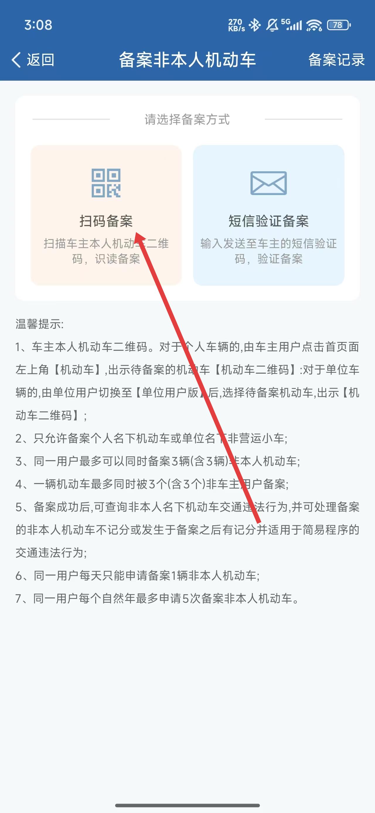 3、在備案非本人機(jī)動(dòng)車(chē)頁(yè)面中,可以點(diǎn)擊掃碼備案選項(xiàng)執(zhí)行備案操作。