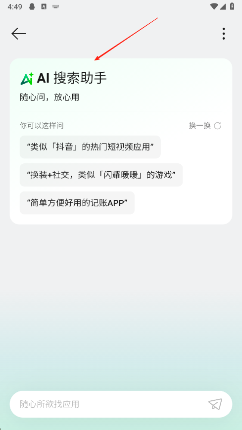 1、新增AI搜索助手功能,進(jìn)入AI搜索助手頁(yè)面,可看到熱門短視頻應(yīng)用等示例問(wèn)題,也能在底部輸入框中輸入想要查找的應(yīng)用相關(guān)內(nèi)容,點(diǎn)擊發(fā)送按鈕,獲取搜索結(jié)果。