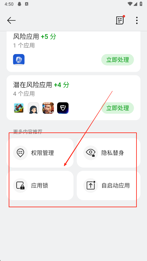 2、在應(yīng)用管理相關(guān)頁(yè)面,能看到風(fēng)險(xiǎn)應(yīng)用,潛在風(fēng)險(xiǎn)應(yīng)用提示,可點(diǎn)擊立即處理進(jìn)行操作,同時(shí)還有權(quán)限管理,隱私替身,應(yīng)用鎖,自啟動(dòng)應(yīng)用等功能選項(xiàng)。